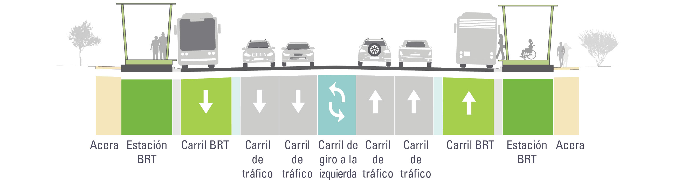 Local buses can use the BRT lane and general traffic can make right-turns from the BRT lane | Only BRT buses are allowed in the BRT lane |